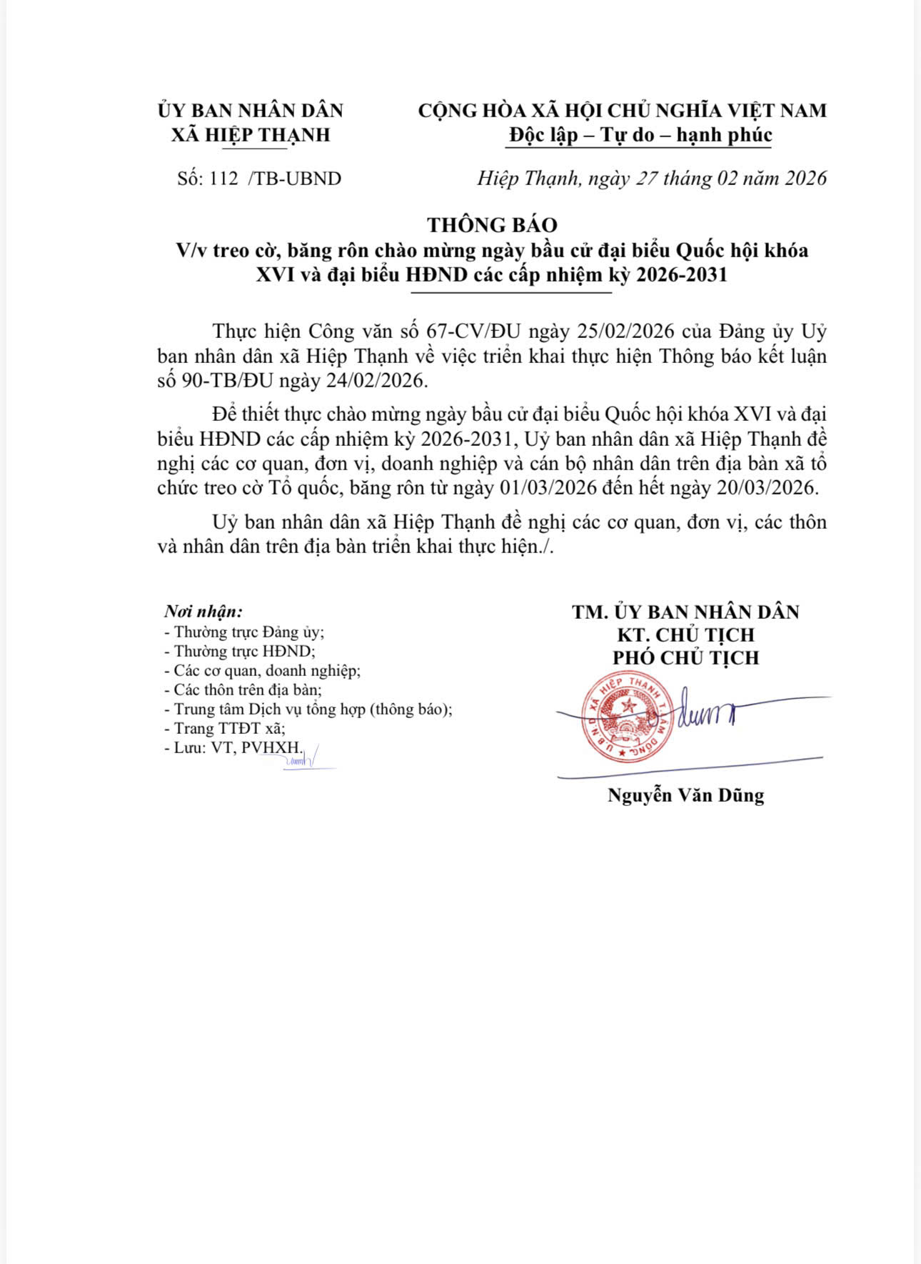 Thực hiện chỉ đạo của Đảng ủy và UBND xã, Ủy ban nhân dân xã Hiệp Thạnh ban hành Thông báo số 112/TB-UBND ngày 27/02/2026 về việc treo cờ Tổ quốc, băng rôn chào mừng ngày bầu cử đại biểu Quốc hội khóa XVI và đại biểu HĐND các cấp nhiệm kỳ 2026 – 2031.